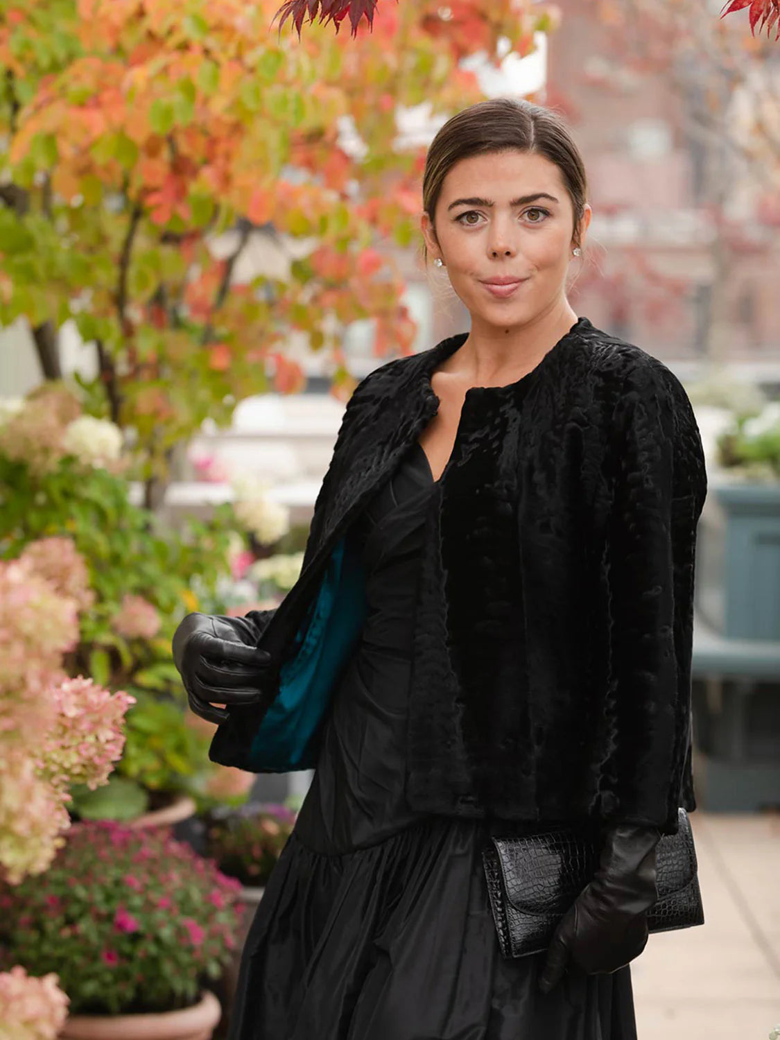 A beautifully cut broadtail jacket that will quickly become molded to your body and feel like a second skin. A style originally designed for Amanda Ross, a true beauty inside and out. This is a piece you will reach for again and again - feminine and elegant. Shown here in black broadtail, but also available in natural grey or dyed navy. Customization of pattern, fur color or lining will incur an additional charge.Made-to-order only, please allow 4 weeks.