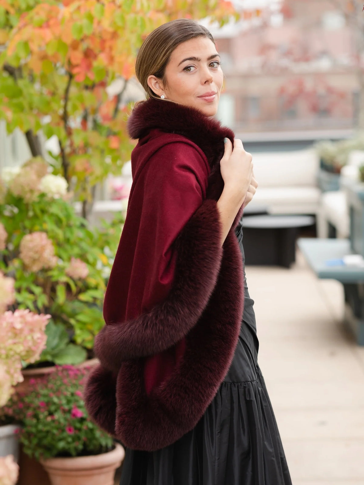 A perfect semi-circle of the finest Scottish or Italian cashmere trimmed all around and on both sides in tonal fur. Shown here with fox, but can also be made with mink, sable or chinchilla. Made to order in a range of colors including burgundy, navy, black, green, camel. Please allow 3 weeks for delivery, a bit more for custom colors. One size.