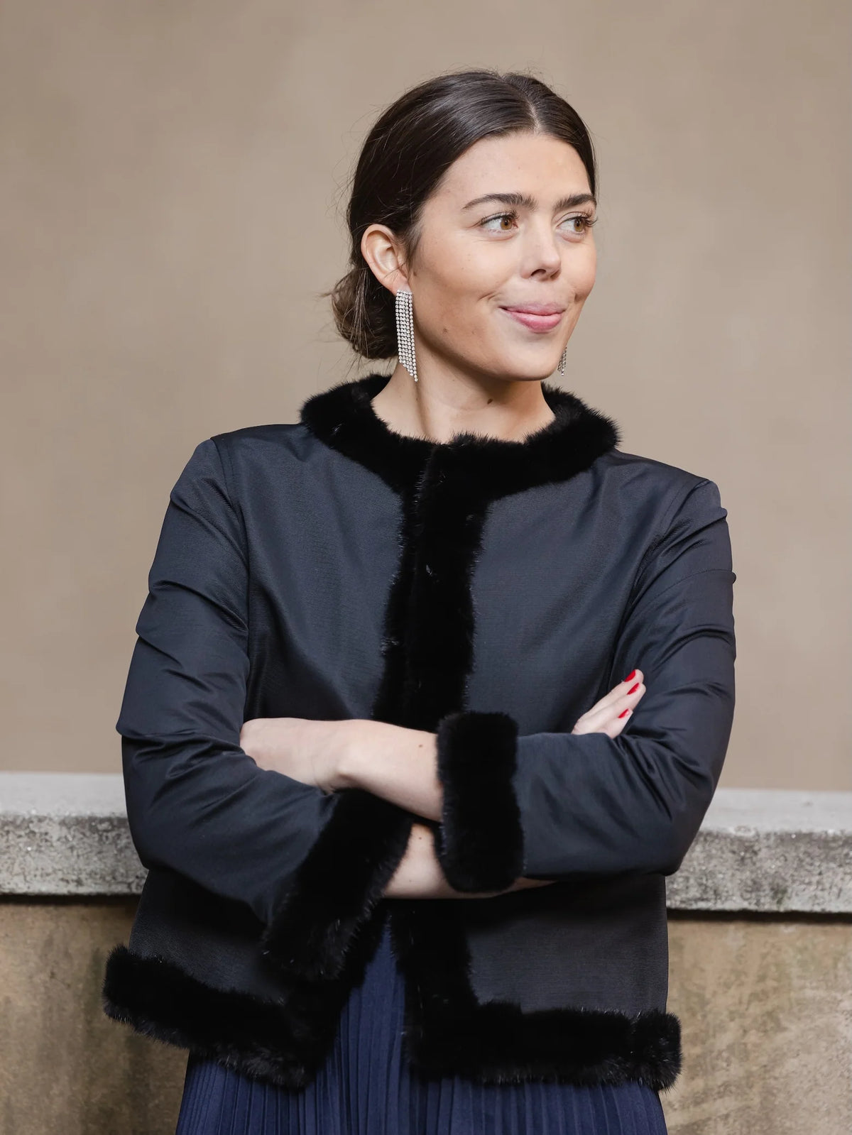 Our Colette jacket is the one you reach for. Chic and easy, wear it with denim or a cocktail dress. This custom-made piece is intended to be a boxy fit with a bracelet sleeve made in your choice of fabrics and as much fur as you'd like. Shown here in black silk taffeta with mink trim all around, and green duchess silk satin with matching mink cuffs. We love using tweeds from Scotland as well as deadstock fabrics sourced in NYC. The options are endless!