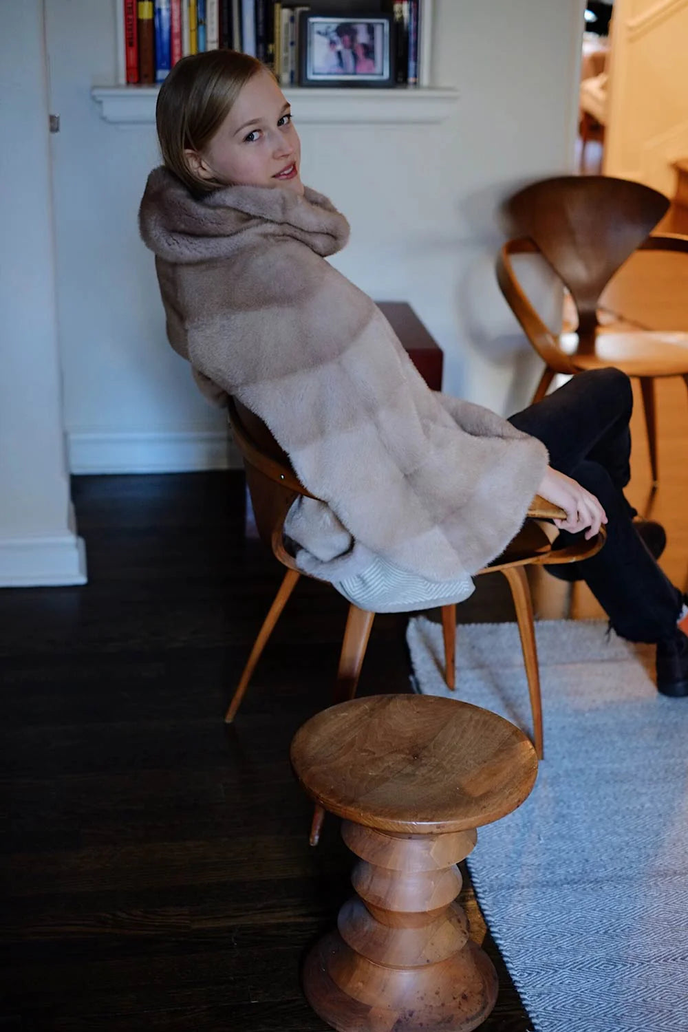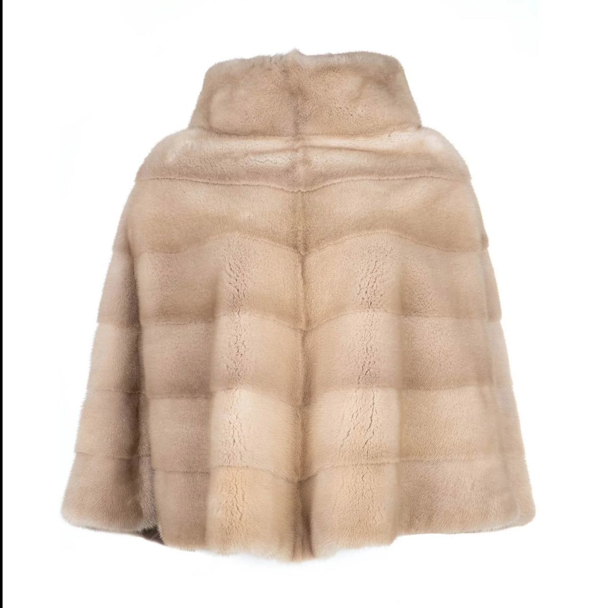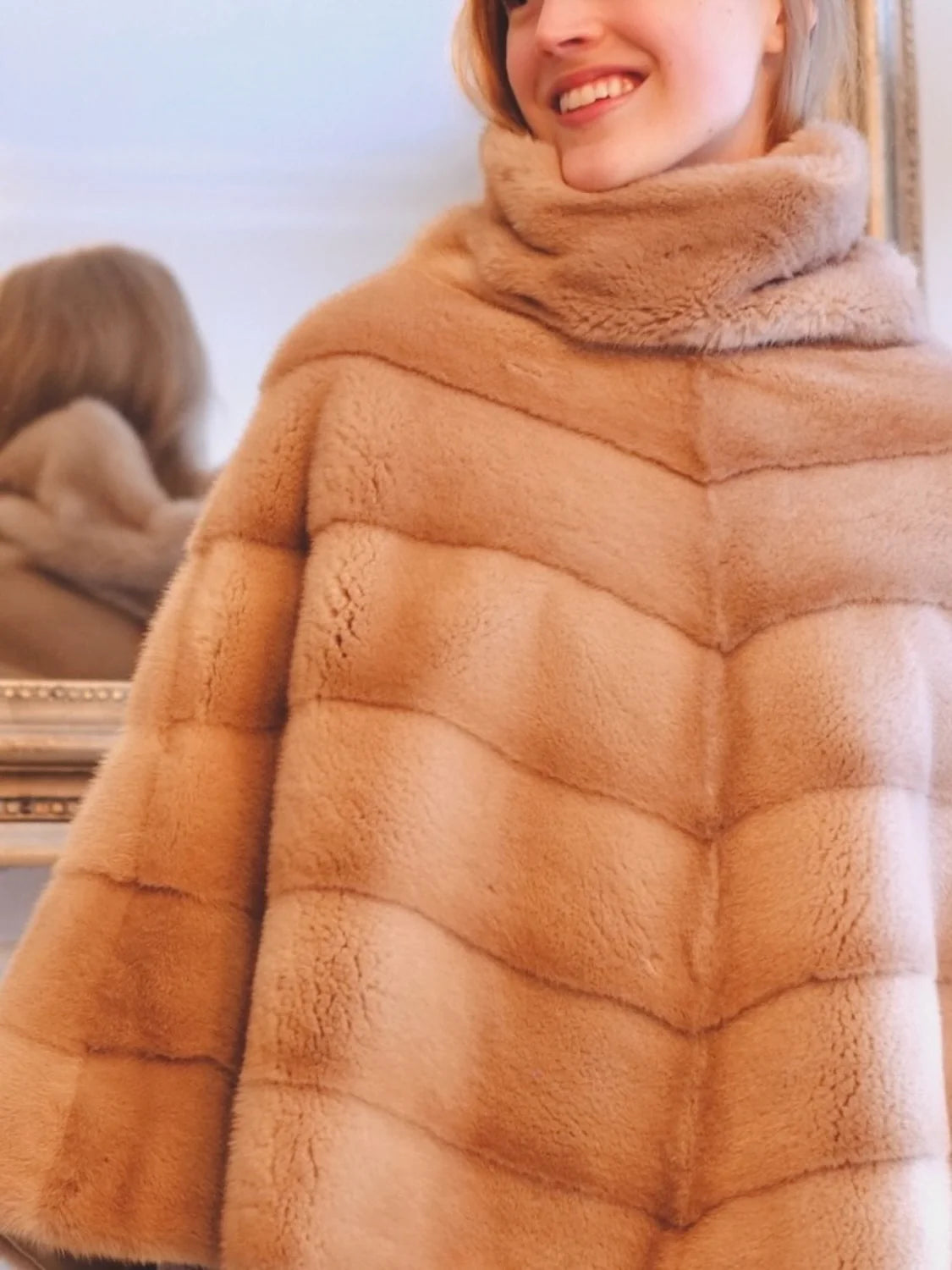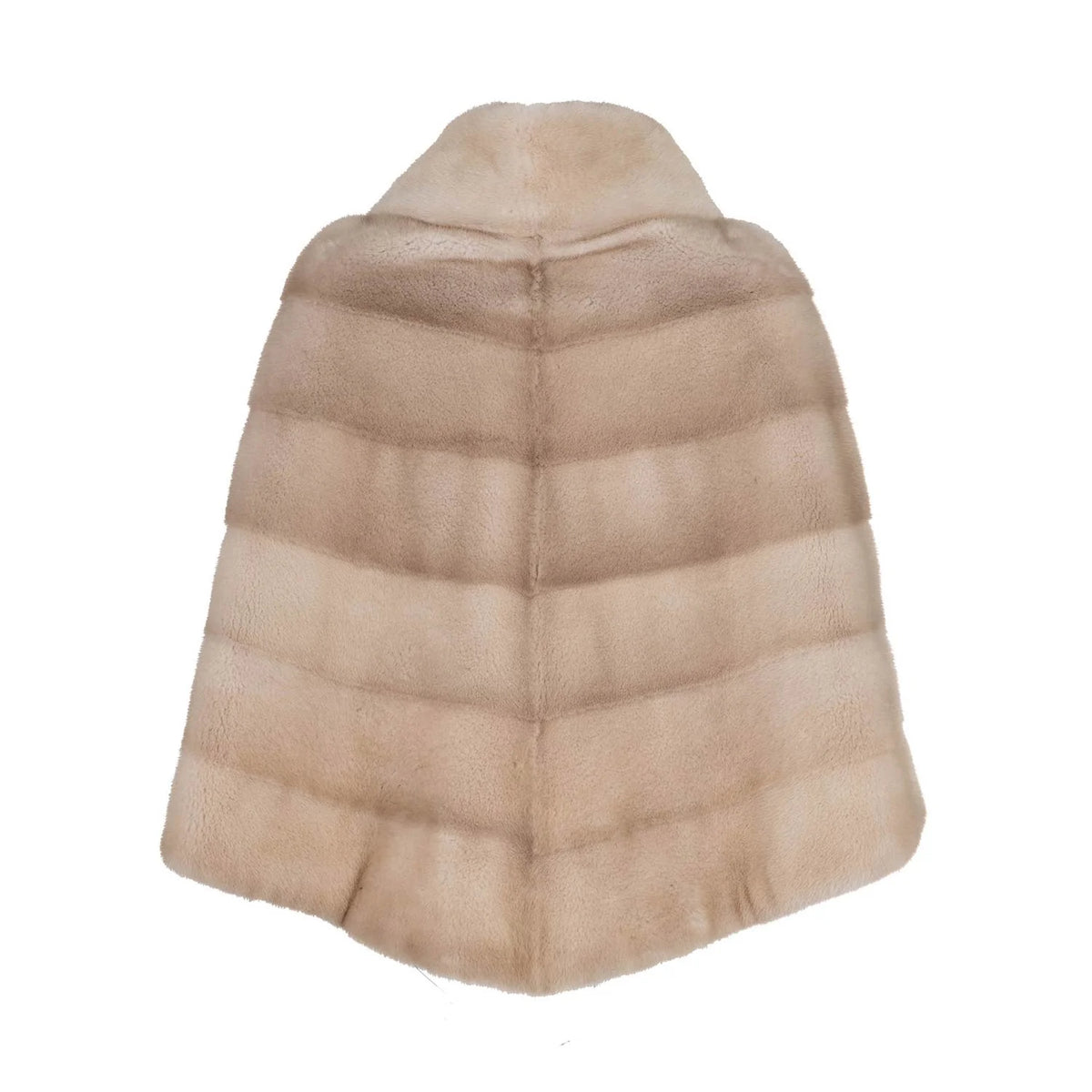 A luxurious mink poncho arranged in a chevron pattern with a generous cowl neck collar. Shown here in palomino mink, but can be made in any color desired. Please allow four weeks, custom colors a bit longer.